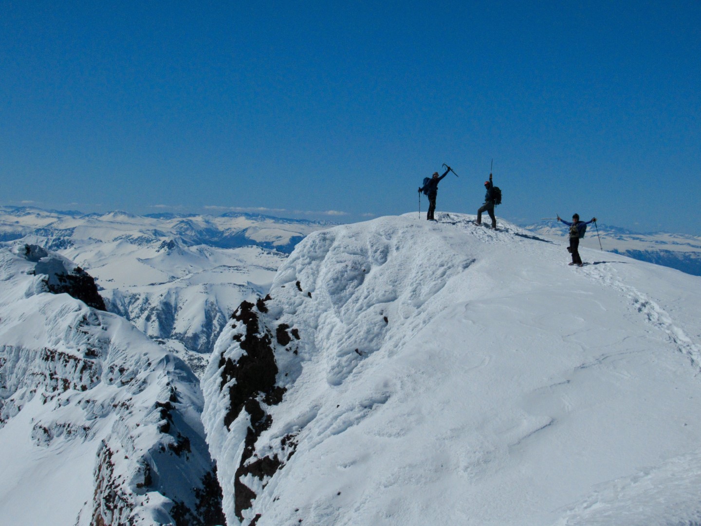 Here the navigation will be critical to mainly get under the rock band, which is the most expose place of the route, once you get there traverse it and after go up and west all the time until you get to a ridge. One there goes down (or traverse) and then up towards the southwest ridge of the mountain. Until here the use of skis is no problem, but as soon as you get close to the summit ridge the use of crampons and ice axe will be necessary because the climb of a short, but expose slope.